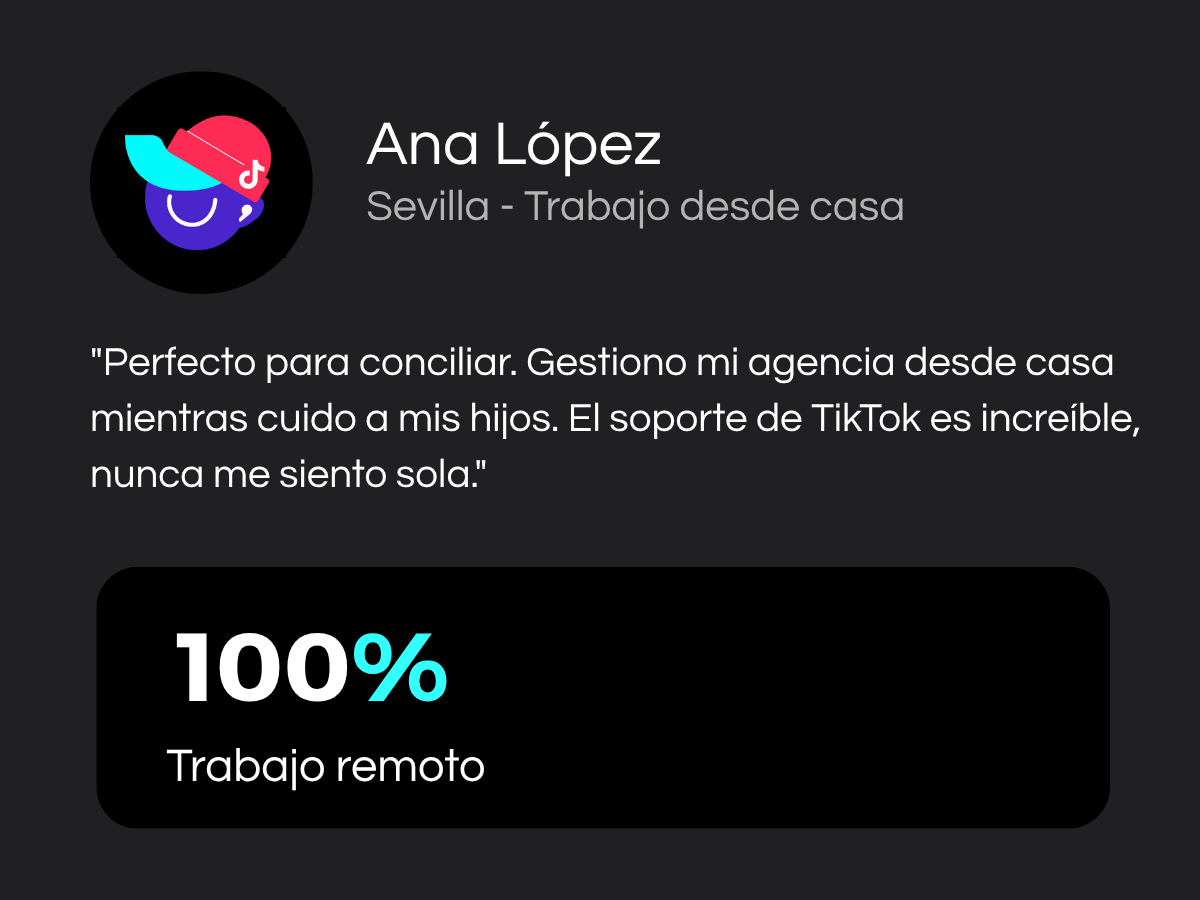 Gestiona tu agencia desde cualquier lugar. Solo necesitas 3h/día para reclutamiento, 2h/día para gestión y 2-3h/semana para formación con TikTok.